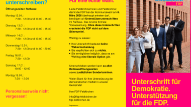 Wir laden Sie herzlich dazu ein, sich mit den liberalen Positionen der FDP auseinanderzusetzen. Die FDP ist eine Mitmachpartei - wir freuen uns über Ihre Teilnahme und Mitgestaltung der liberalen Politik in Feldkirchen. Besuchen Sie gerne jederzeit unsere liberalen Monatstreffen und lernen Sie uns persönlich kennen!